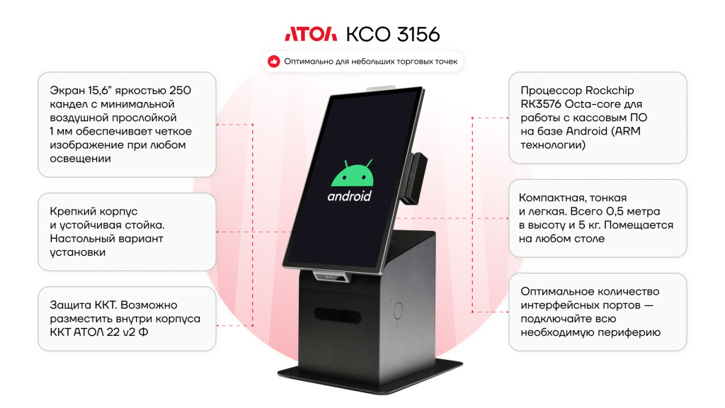 АТОЛ КСО 3156 — первая в линейке АТОЛ касса самообслуживания на Android а также самая компактная и бюджетная КСО в нашей линейке. Сократит ваши затраты на привлечение персонала и увеличит лояльность ваших покупателей. Идеально подойдет небольшим торговым точкам и предприятиям сферы услуг.