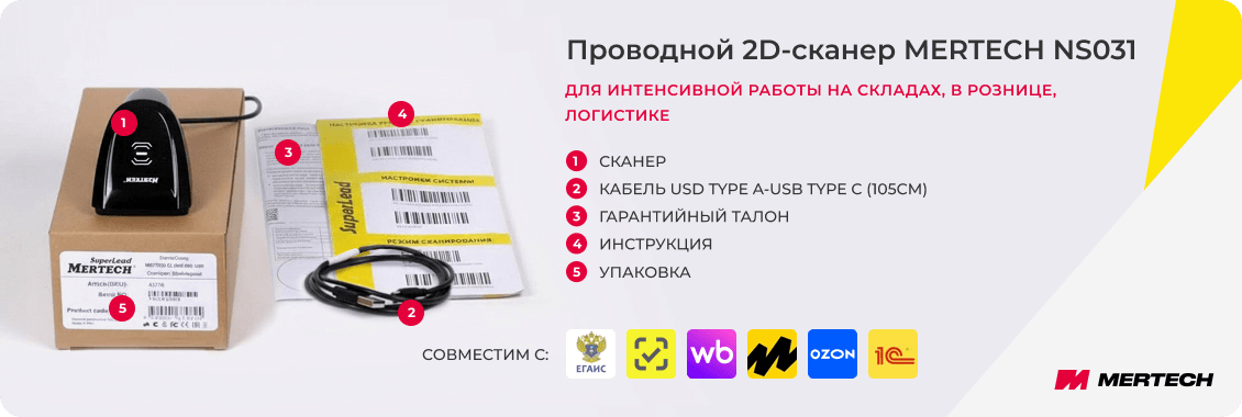 MERTECH NS031 подключается по интерфейсу USB 2.0 и поддерживает режимы USB-HID и USB-COM (эмуляция), а также RS232 (опционально). Сканер не требует сложной настройки и легко интегрируется с кассовыми и товароучётными системами.